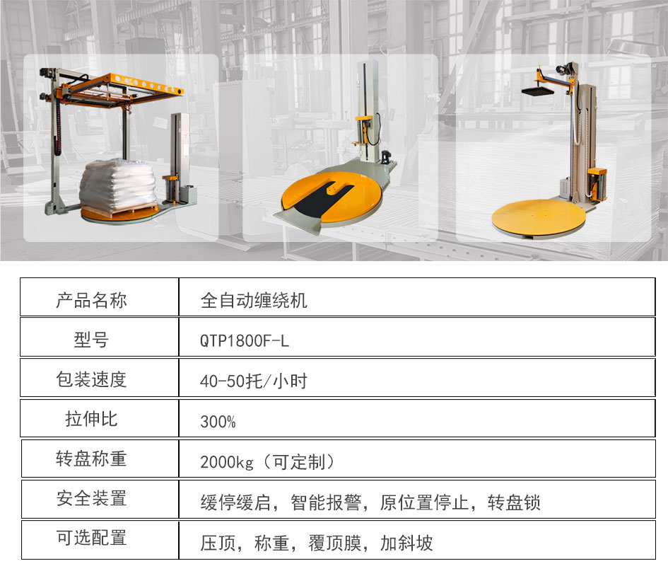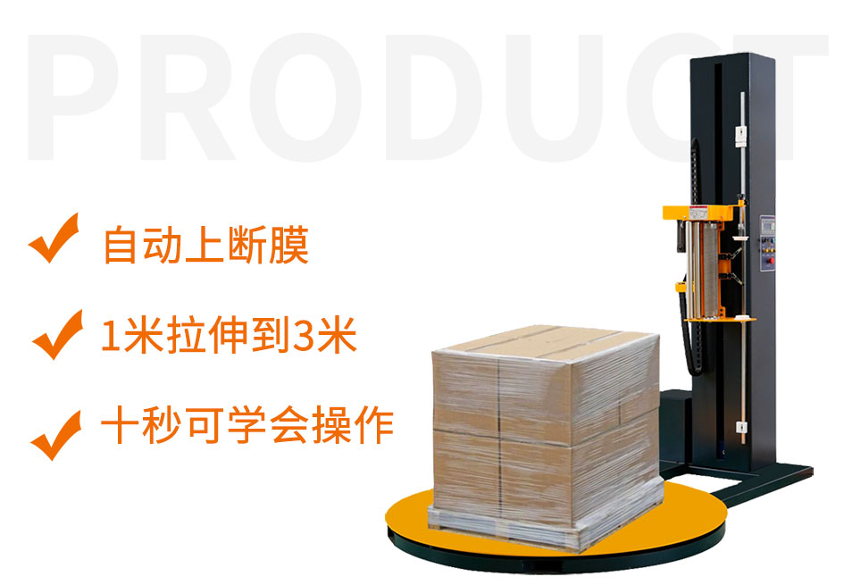 大宏佳森全自動遙控纏繞機(jī)QTP1800F-L采用全自動上斷膜裝置,搭配遙控裝置,操作員無需下叉車,