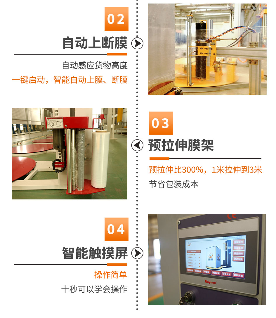 設(shè)備自動停止,無需人工斷膜。設(shè)備可搭配覆頂膜裝置、稱重裝置、加壓裝置讓設(shè)備的使用范圍更廣。