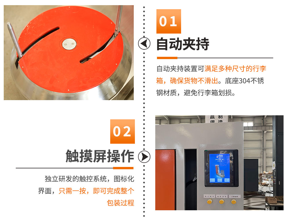 然后操作人員按操作面板上的啟動按鈕,設備自動進行包裝,一般行李包3—5層即可!包裝完畢后,操作人員手工切斷薄膜,然后取走行李!