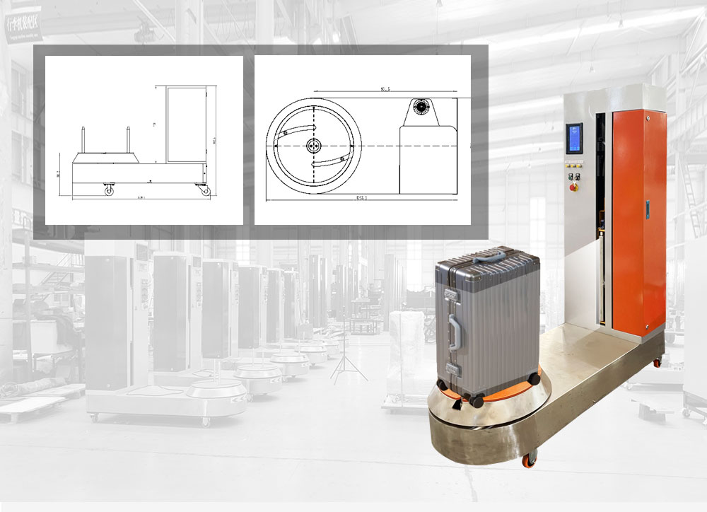 設備可以移動,操作人員將行李放到轉臺上,并根據(jù)行李的大小來調節(jié)垂直桿,從而使行李可以平穩(wěn)的放在轉臺上。