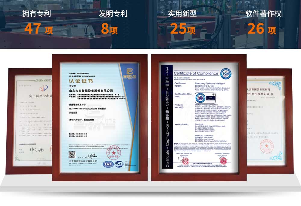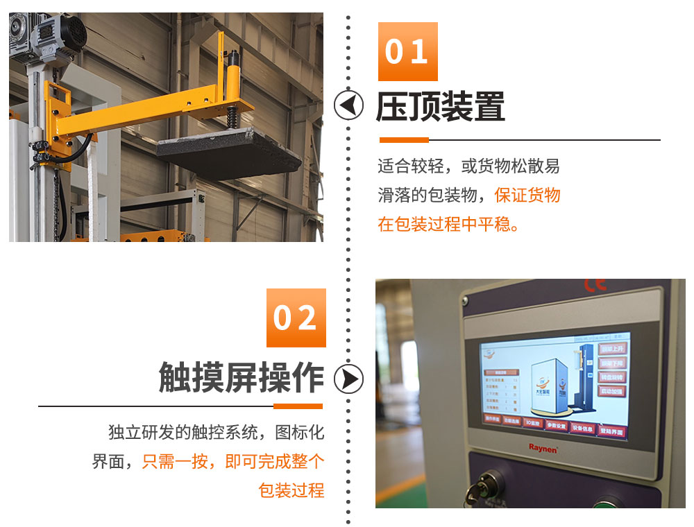 大宏佳森壓頂型托盤纏繞機TP1650F-CS采用電動加壓裝置,全程壓頂,針對于單個貨物較輕及碼垛較高的托盤纏繞,